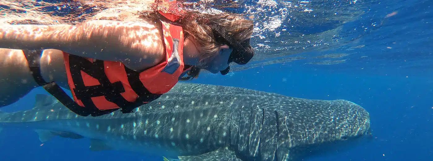 - Swimming with whale sharks. They are gentle giants that can reach upwards of 40 feet long. Although whale sharks are the third biggest creature in the ocean (after blue whales and fin whales) they are not aggressive and don’t threaten humans. Their interactions with humans are peaceful and curious.